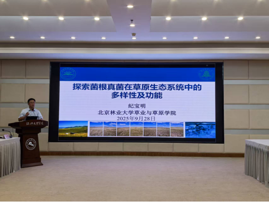 纪宝明教授作题为“探索菌根真菌在草原生态系统中的多样性及功能”的报告,系统回顾了我国北方草地丛枝菌根真菌多样性和生态功能,阐述了其团队在菌根真菌与植物互作机制研究中的最新进展和菌根真菌在草地生态保护中的应用策略。